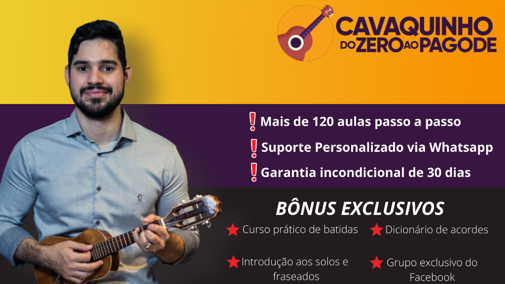 Através de 4 etapas simples e diretas, você vai sair do zero e tocar suas primeiras músicas no cavaquinho, de um jeito leve e divertido – Esse é o Método Do Zero Ao Pagode